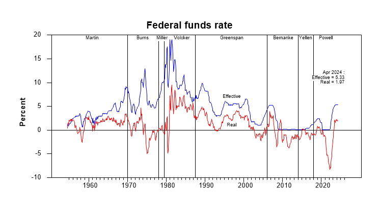 The graph below shows the monthly course of the federal funds rate from 1954 to the present, with labels identifying the time periods corresponding to each custodian of the proverbial punch bowl. The figure shows both the effective nominal rate tested by Bernanke and Mihov and a simple measure of the real rate obtained by subtracting inflation (consumer price index) over the previous twelve months.