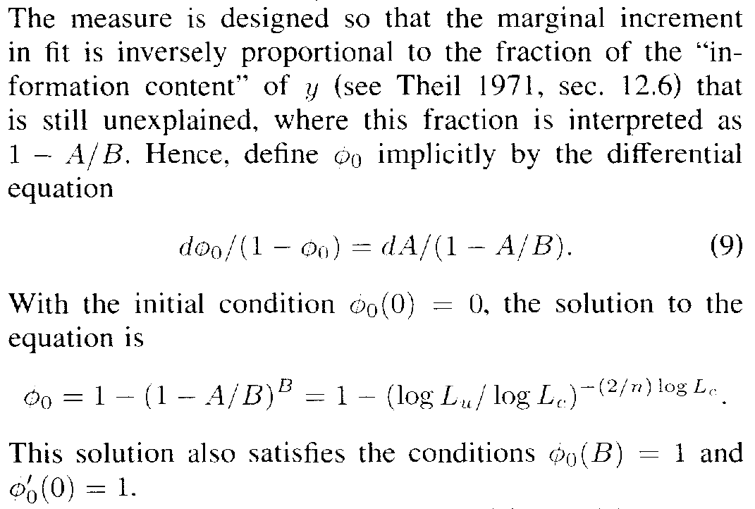 The solution to the problems of the existing measures was conceptually clear: construct a likelihood-based measure that covers the right range of values and grows with the fit of the model at a pace analogous to that of the linear model. In that case, its interpretation would be similar to that of the linear model R squared. The solution is derived in the excerpt below from Estrella (1998) by solving a differential equation that gives precise mathematical meaning to the conceptual goal.