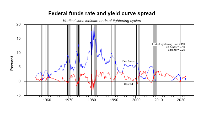 In the papers cited at the bottom of this page, we identify the ends of 14 monetary tightening cycles in the U.S. economy from 1955 to 2006 (denoted in the graph below by vertical grid lines). Ten of these cycles were followed by NBER-dated recessions (shading) and 11 were followed by increases in the unemployment rate (see table). The updated paper shows that a recession has generally followed the end of a tightening cycle if the yield curve spread is less than 0.78% in the month when tightening ends (level determined by statistical analysis). Only one case (1966) was incorrectly classified by this rule of thumb, but even in that case there was a subsequent rise in unemployment, as in all the recessions. The papers describe the methodology and provide detailed results.